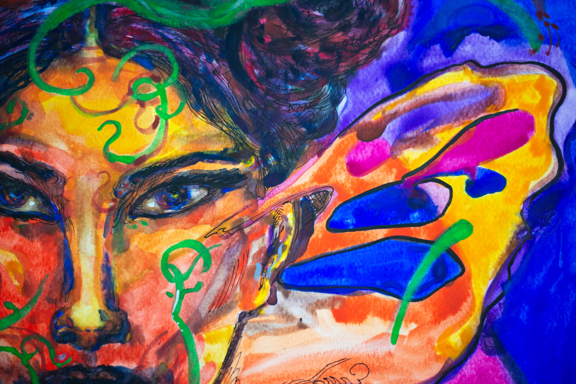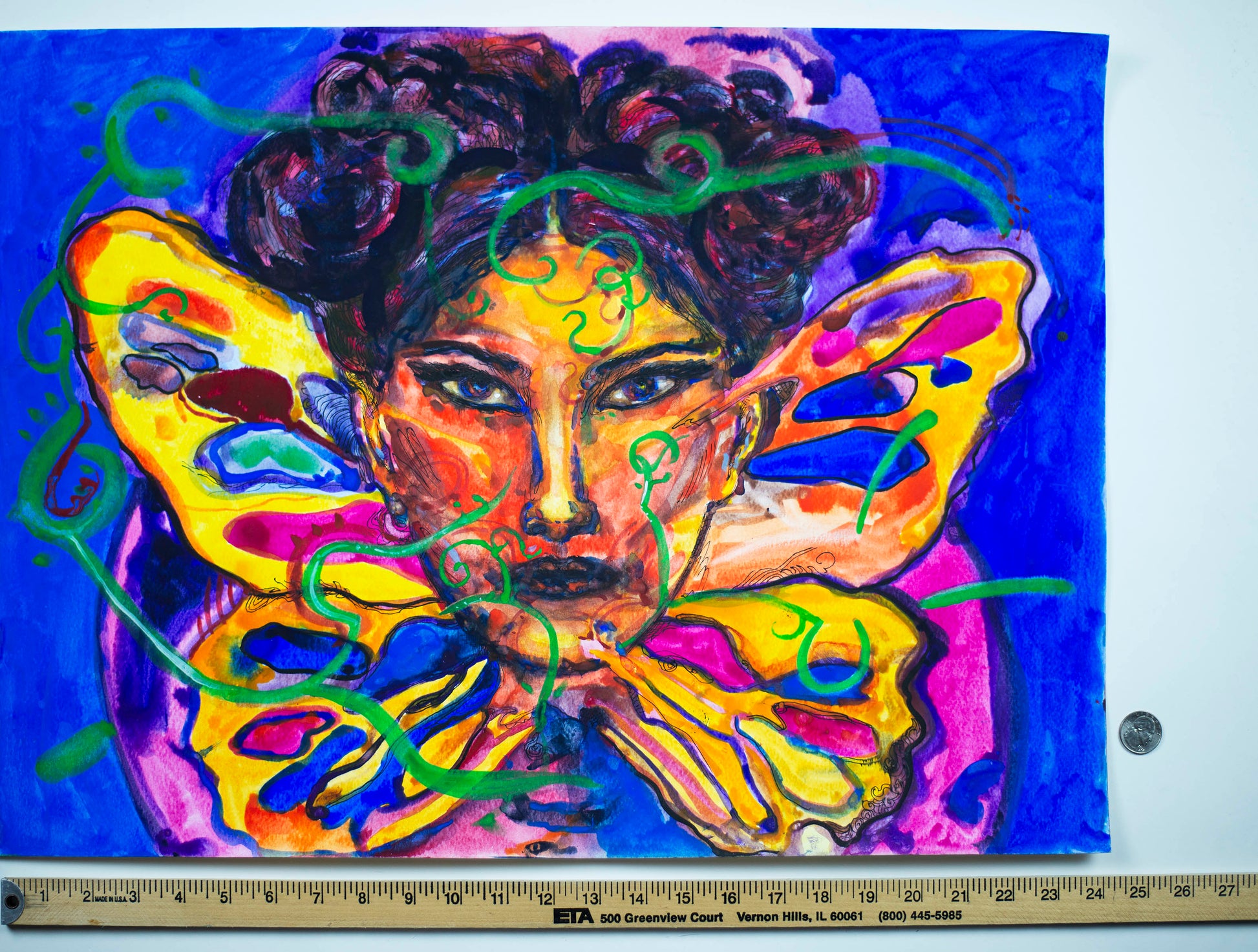 A captivating and vibrant masterpiece depicting a person with an oversized head where a large golden butterfly overlaps and integrates with parts of the face, adorned with flowing green ribbons creating a mesmerizing layered composition. This explosive watercolor celebrates enchantment, transformation, and mystical beauty through bold electric neon colors in true RebelsArt style.