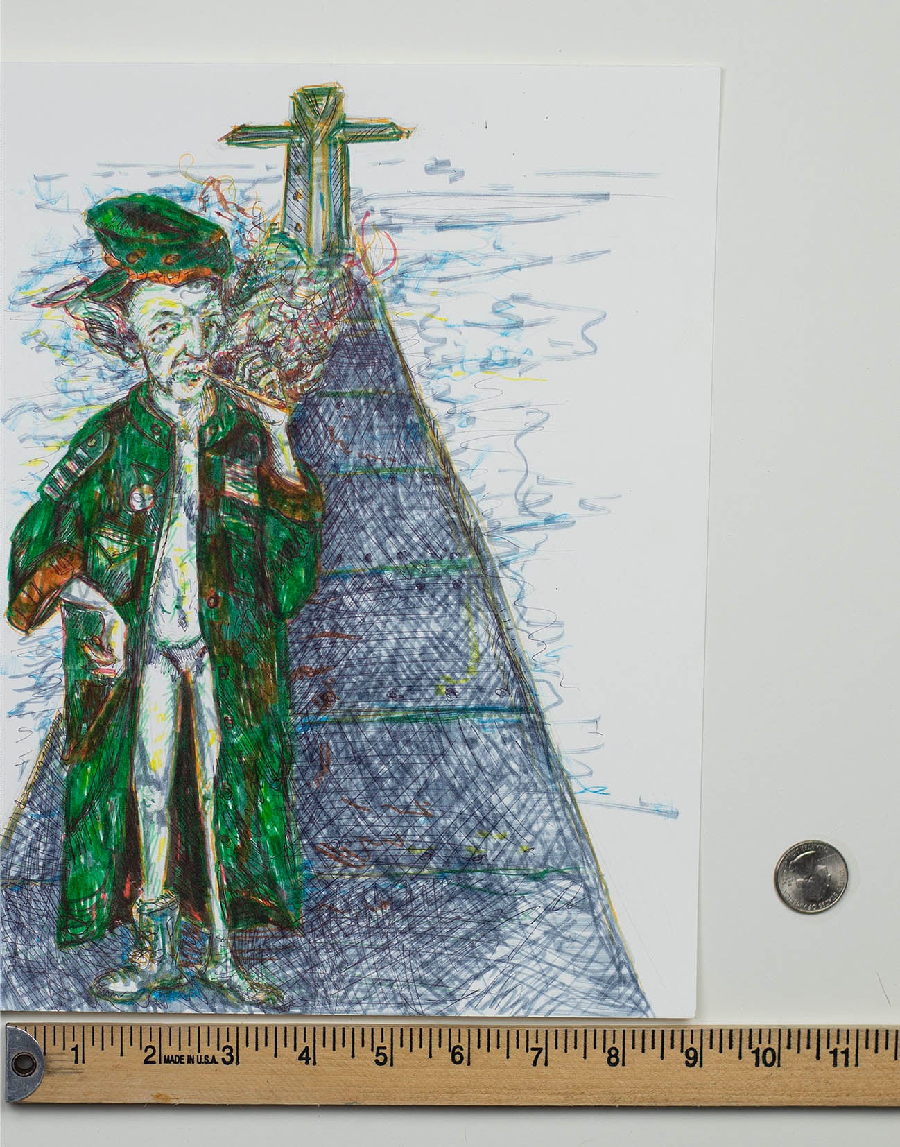 The composition features a distinguished captain figure alongside his sailing vessel, surrounded by flowing artistic marks and maritime elements. The interplay of realistic nautical details with abstract surrounding energy creates visual excitement and seafaring adventure. The colorful lines suggest the overwhelming nature of ocean exploration and artistic freedom.