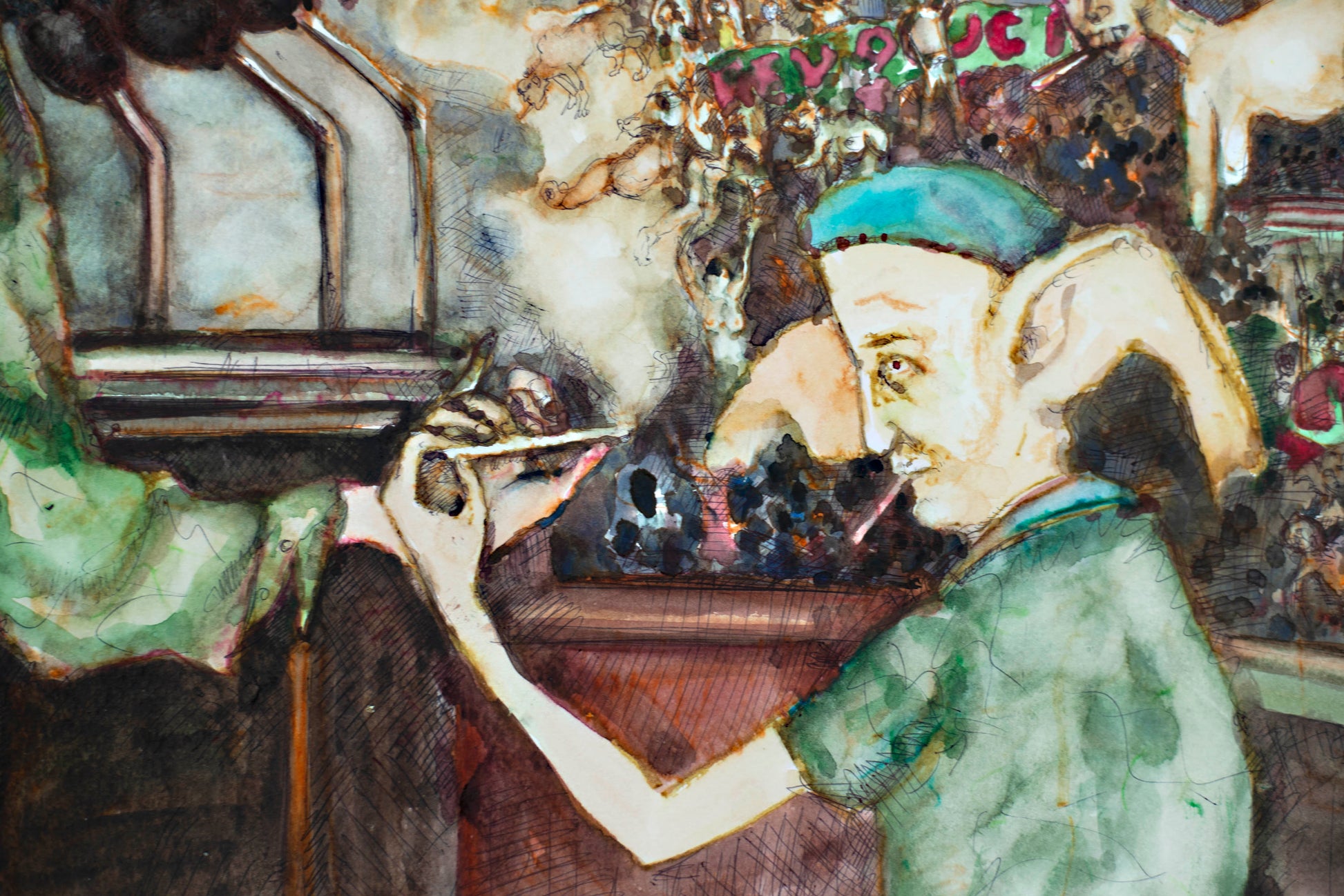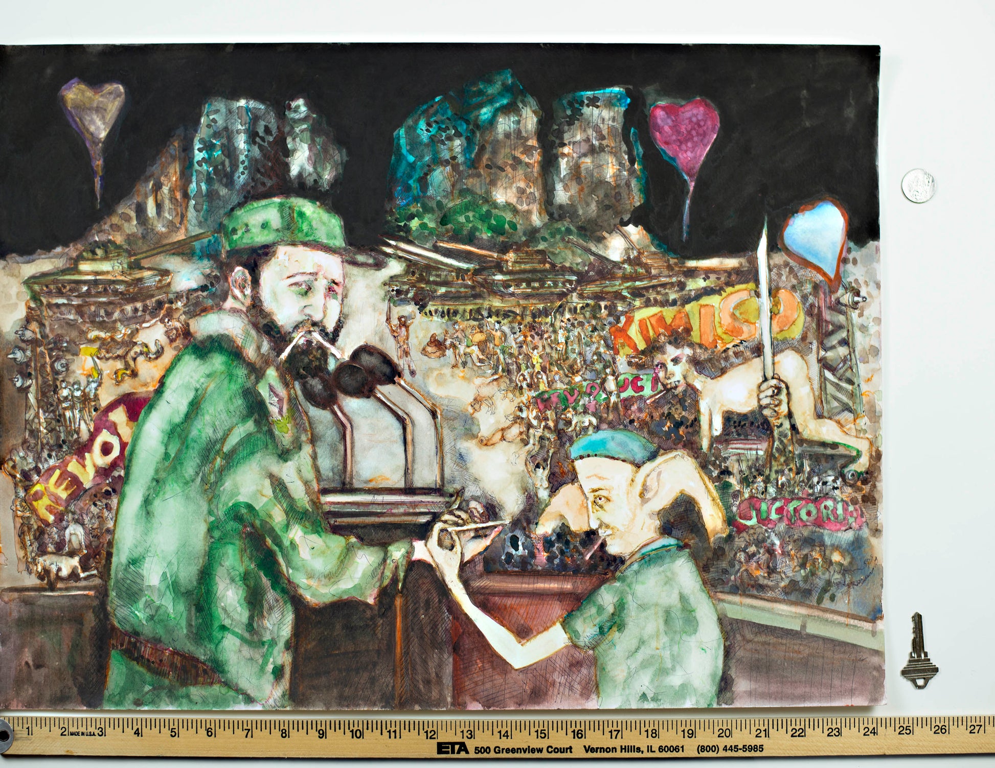 Discover the beauty of spiritual transformation with this captivating original drawing that blends ethereal elements with rebellious artistic expression. This extraordinary piece features a contemplative figure in green robes, surrounded by mystical smoke patterns and floating heart symbols, creating an atmosphere of ethereal rebellion and transcendent spiritual awakening.