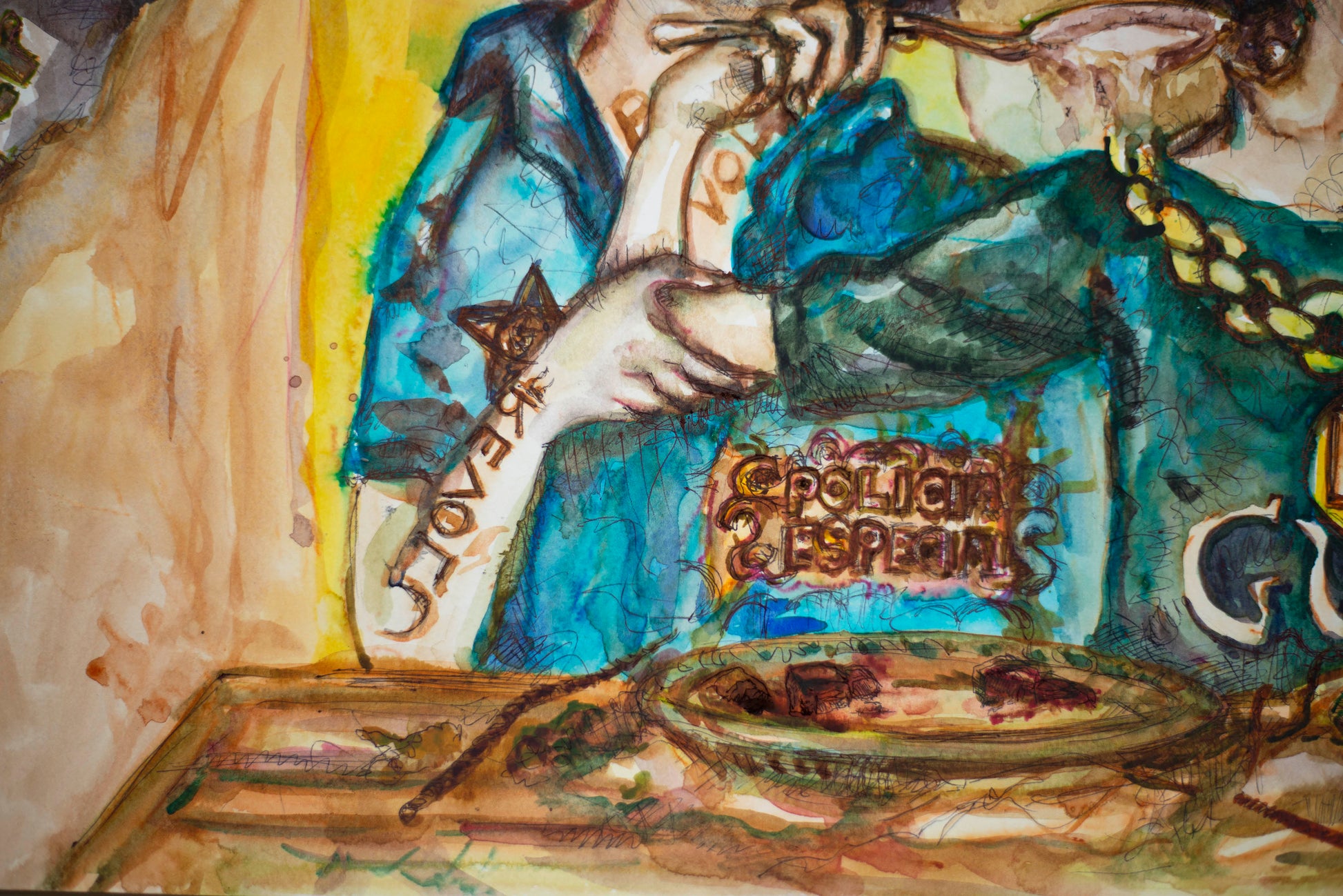 The warm golden-yellow background radiates ironic opulence, while meticulous ink work brings sharp detail to every brand logo, tattoo, and symbolic element. This piece challenges viewers to examine how consumer brands shape identity and relationships with both humor and critical insight.