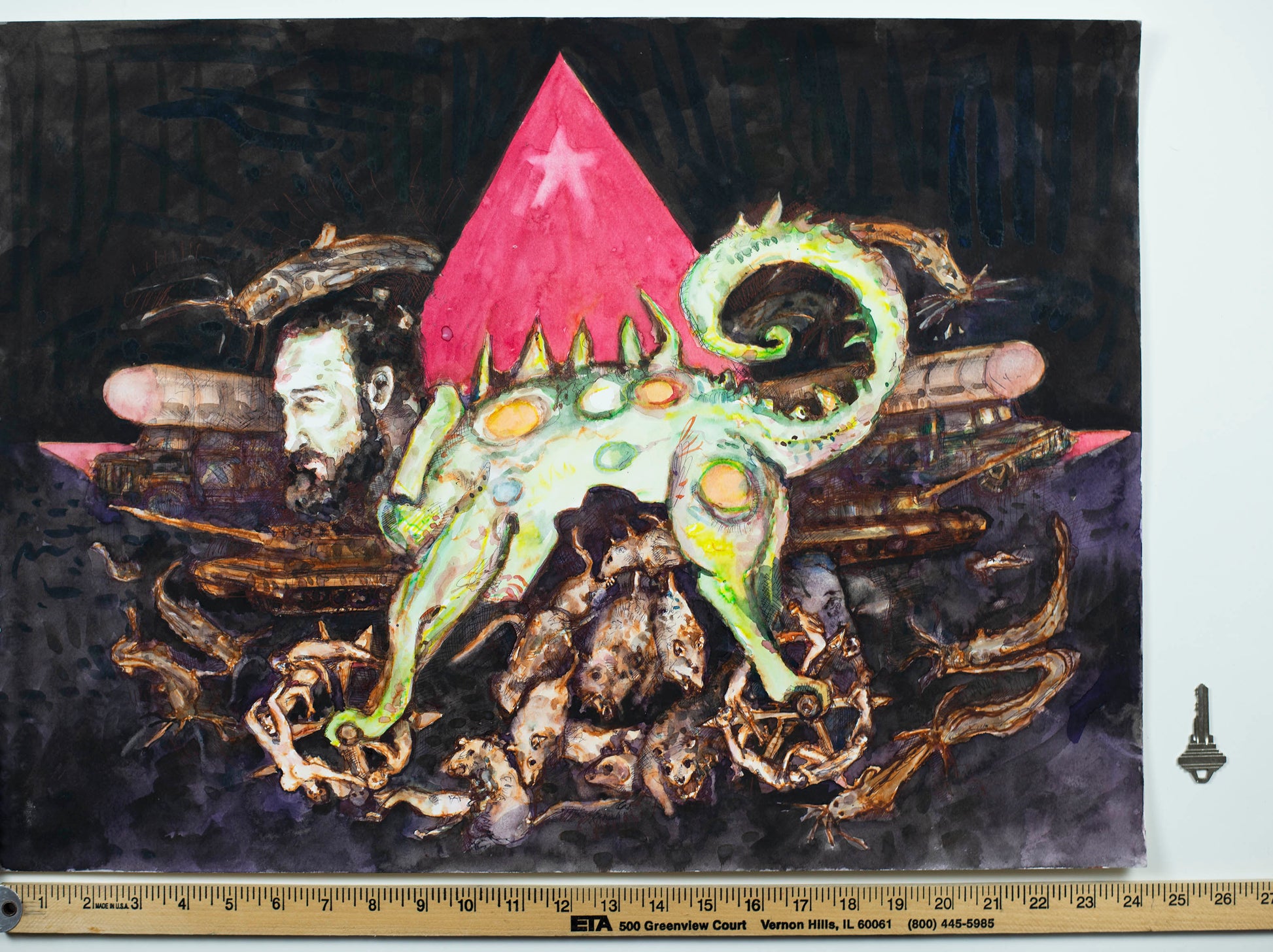 Experience the power of creative rebellion with this stunning original drawing that captures mystical energy and artistic freedom. This one-of-a-kind piece features a compelling narrative of a bearded mystic figure alongside a supernatural octopus creature, crowned by a powerful red triangle symbolizing transformation and rebellion.
