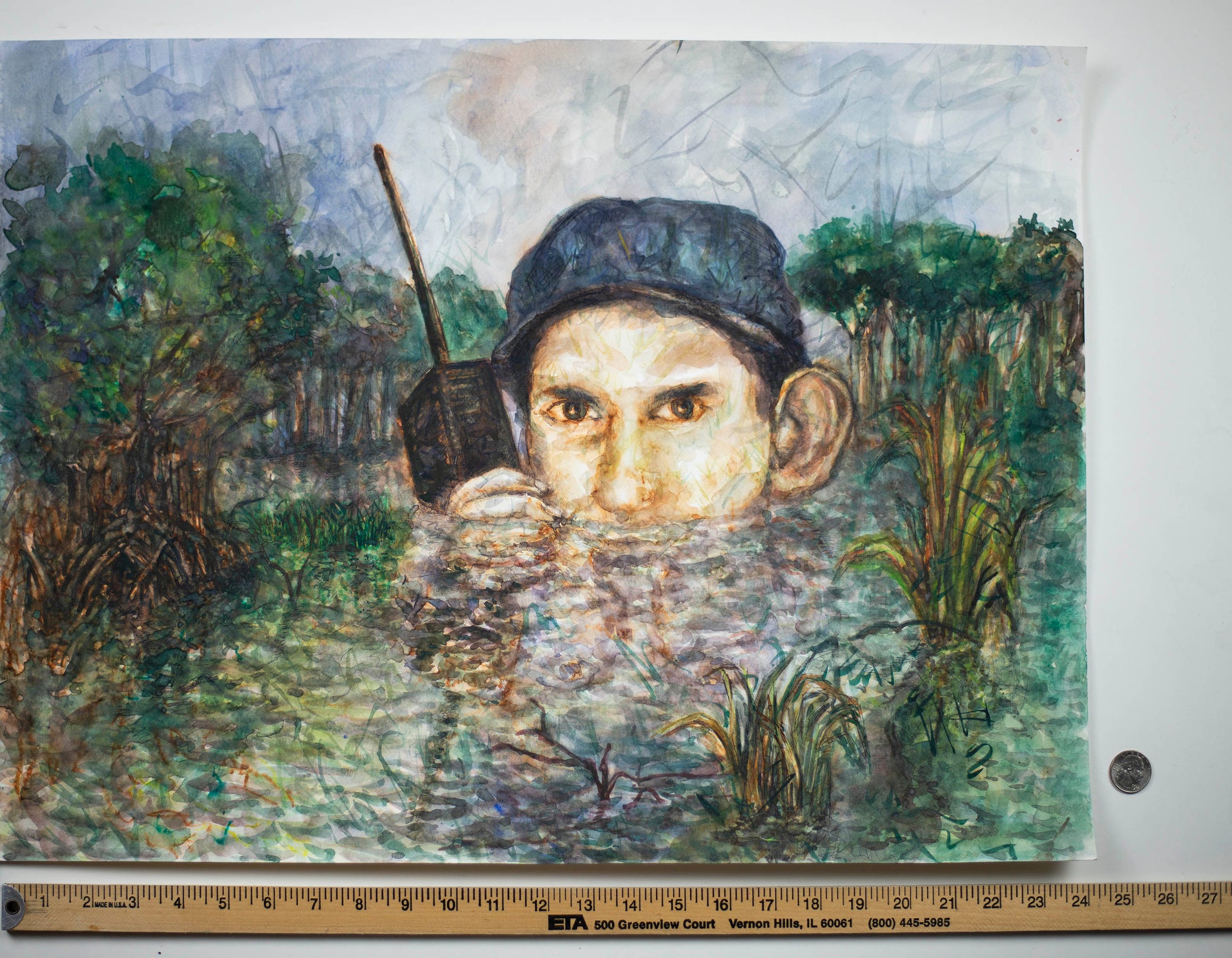 A haunting and surreal masterpiece depicting a figure with oversized ears emerging from murky jungle waters, equipped with a communication device. This atmospheric watercolor creates a powerful commentary on surveillance, information gathering, and the loss of privacy in even the most remote places.
