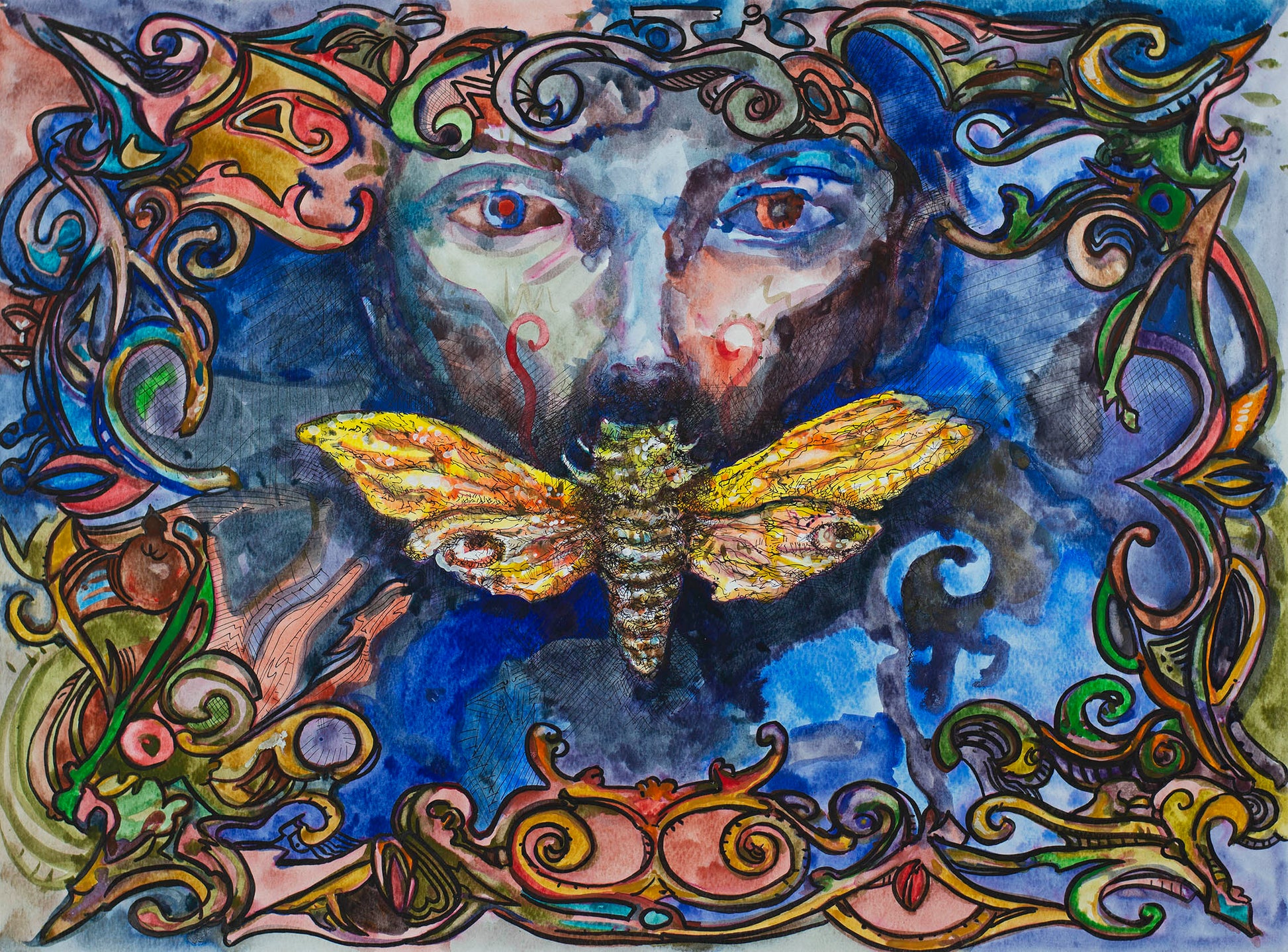 The deep moody blue background creates a mystical atmosphere, while brilliant golden yellows illuminate the moth's intricate wings. Meticulous ink work brings extraordinary detail to the ornamental border with its swirling Victorian flourishes, the moth's delicate patterns, and the contemplative face with its penetrating gaze. The expressive features radiate quiet power with mystical and rebellious artistic elements representing spiritual wisdom and creative freedom.